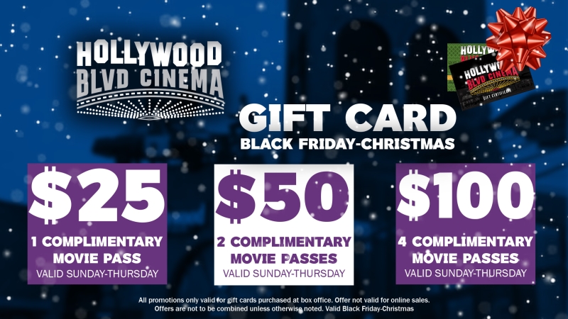 Purchase a gift card in person, get free movie tickets! $25 gets you one movie pass, $50 gets you two movie passes, and $100 gets you FOUR movie passes!